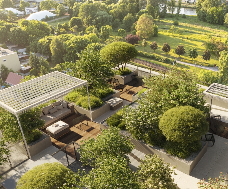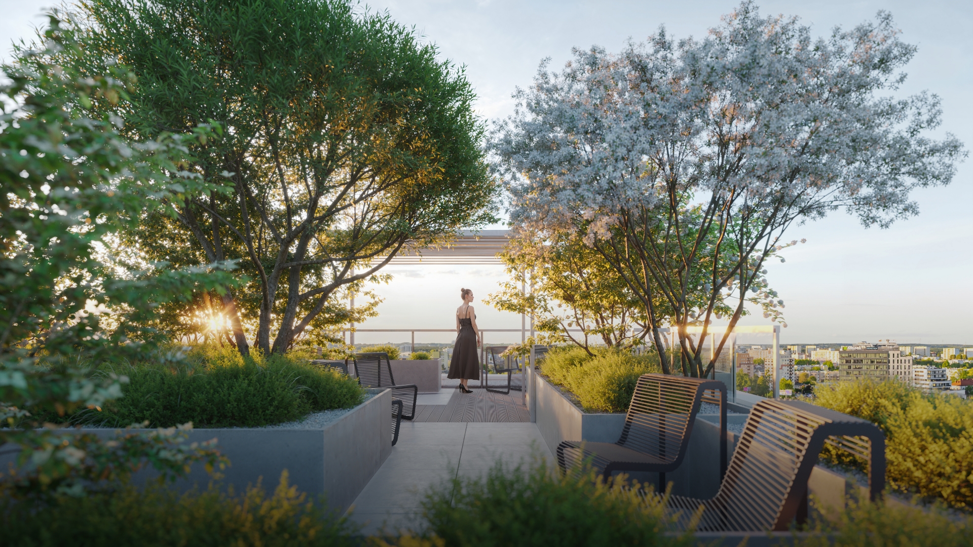 Taras zapewni nie tylko zachwycające widoki na panoramę miasta. To także miejsce relaksu, pracy i spotkań, otoczone starannie dobraną roślinnością.