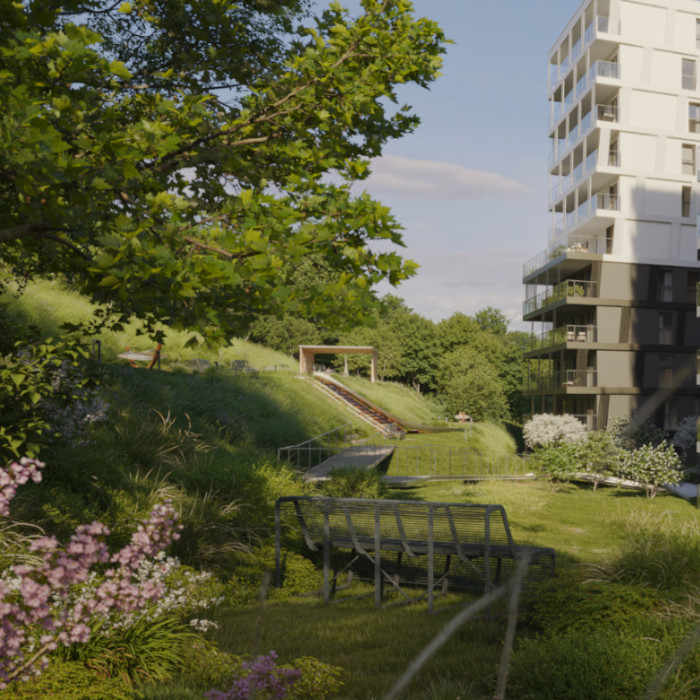 Malownicza skarpa i starannie zaprojektowana zieleń sprawiają, że każdorazowe przekroczenie progu dziedzińca staje się chwilą wyciszenia i wytchnienia od codziennego pędu.