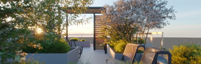 Taras zapewni nie tylko zachwycające widoki na panoramę miasta. To także miejsce relaksu, pracy i spotkań, otoczone starannie dobraną roślinnością.