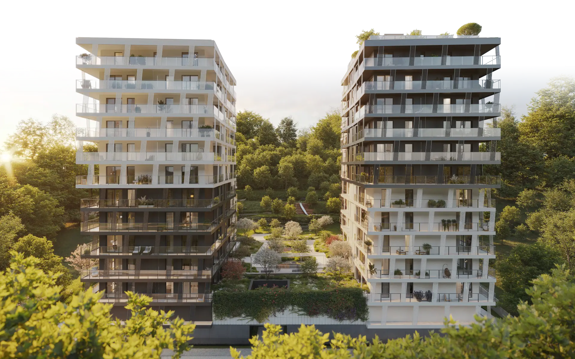 To dwie wieże, posadowione na dwupoziomowej hali garażowej, są połączone dziedzińcem, z którego płynnie przechodzi się na skarpę – inspirację do stworzenia w całym projekcie zielonych stref wypoczynku.